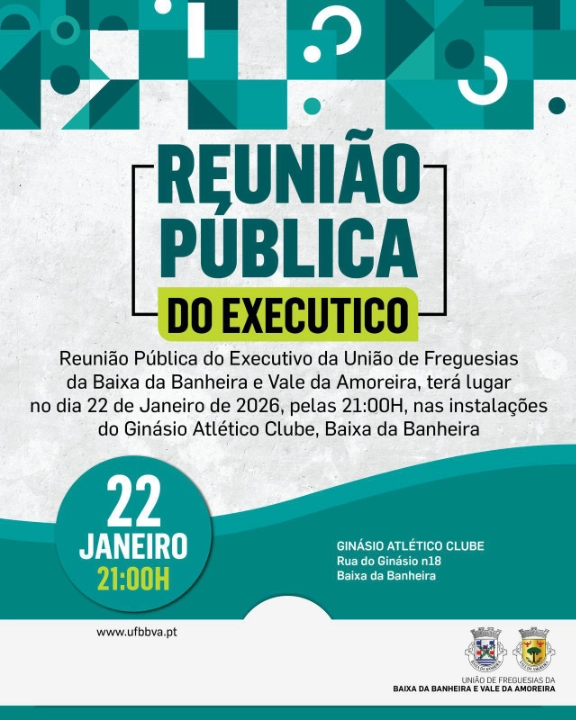 Reunião Pública do Executivo da União de Freguesias da Baixa da Banheira e Vale da Amoreira, terá lugar no dia 22 de Janeiro de 2026, pelas 21:00H, nas instalações do Ginásio Atlético Clube, Baixa da Banheira.